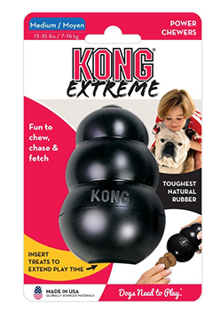 The Kong Extreme dog toy represents the most durable strength of Kong rubber. Designed for the toughest of chewers, the Kong Extreme offers enrichment and helps satisfy dogs’ instinctual needs. The Kong unique, ultra-durable, natural rubber formula is designed for determined chewers, while the erratic bounce fulfills a dog’s need to play. Want to extend play time? Be sure to stuff with tempting bits of kibble and entice with a dash of peanut butter. Add to the fun by adding Kong Snacks and top with Kong Easy Treat. Stuff and freeze for a longer-lasting challenge.