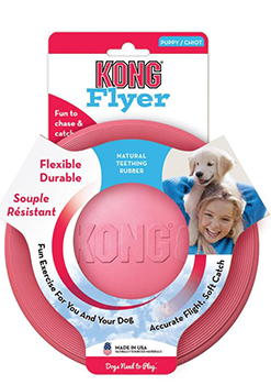 The Kong Puppy Flyer is for puppies that are learning how to play fetch. Made from the Kong Classic unique puppy rubber, this flyer helps make for a softer catch. Sized especially for puppies. Kong Puppy Flyer is ideal for pups up to 9 months of age when they can graduate to the Kong Classic Flyer. Let your puppy's love of fetch take flight with a safer disc that delivers healthy activity.