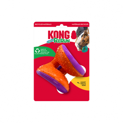 KONG Rerun Whoosh delivers fetching fun with a spot to hold treats to reward puzzling pups. Shaped for dogs to hold comfortably, special nubs clean teeth and gums as they chew. Unique, whooshing sound sparks dogs’ natural instincts while the toy’s erratic bounce fuels fetching fun. Made of 51% recycled material for planet-friendly play.