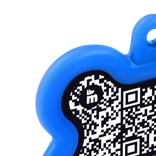 The Hushtag Plus QR Code Black Aluminum Bone ID Tag with Blue Rubber is unique due to its dual identification system. The front features a convenient QR code that can be linked to the free memopet app, allowing you to create a pet profile and easily locate them if lost. The back, on the other hand, is customizable with a clear and durable engraving. Silent and even more resistant, it is meticulously crafted in our Italian workshop. Equipped with a practical ring, it easily attaches to the Tag Holder.