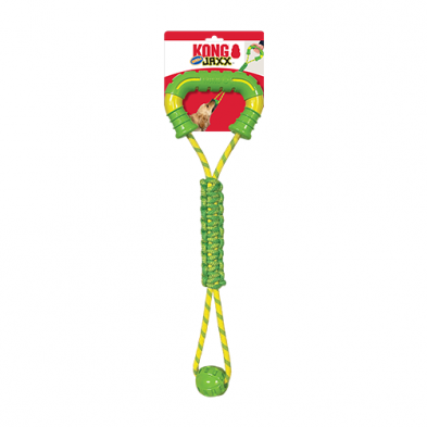 Jumbo-sized, durable fetch-and-tug toy with comfy handles for interactive play and a sliding ball that adds an extra dimension to tugging fun.
